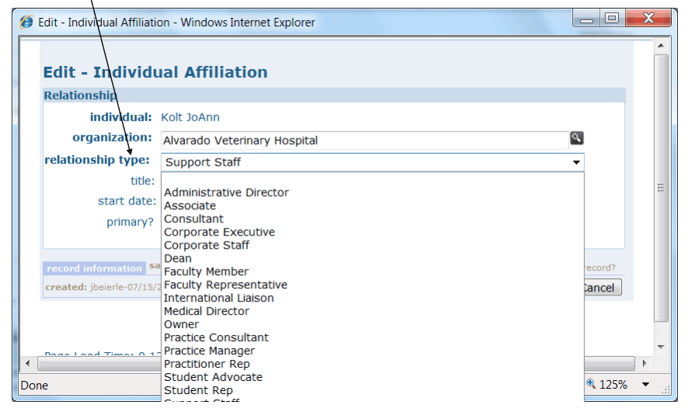 Use the relationship type drop down menu to select the appropriate role. In this case, we are switching her from support staff to veterinary assistant.