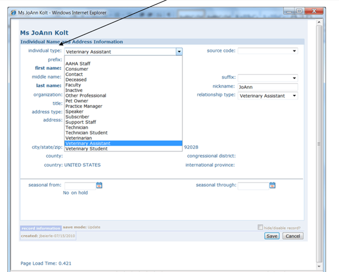 In the Individual Name & Address Information screen, use the individual type drop down menu to select the correct role. Click Save.