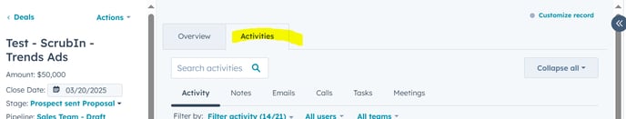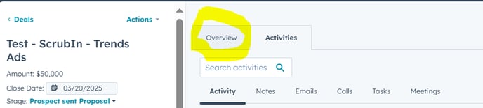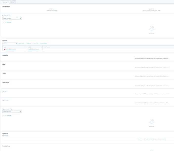 Data Highlights - Create Date, Current Deal Stage and last Activity Date. This can be customized to include additional properties that you would want to see at a glance.