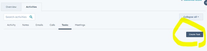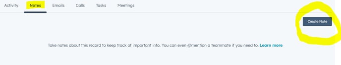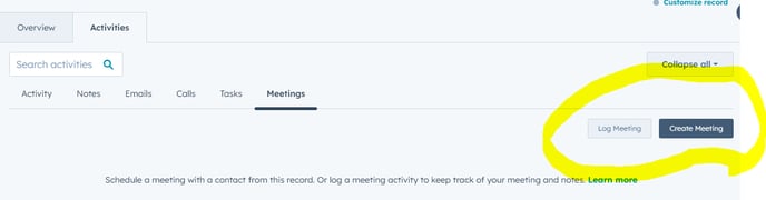 Meetings Tab - Meetings that are set up through your HubSpot calendar will populate here and you can add meeting times and dates manually.