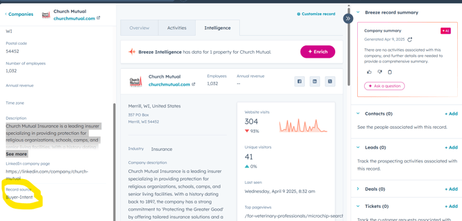You may now view the company and start working the lead. Buyer Intent will be recorded as the lead source.