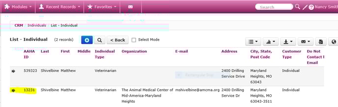 - Click on the arrow next to each duplicate record to determine which record to keep. In this example, will keep record# 13231 because it was determined this record has the current membership and contact info.