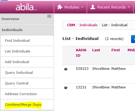 - Once you have determined which record to keep, click on Combine/Merge Dups.
