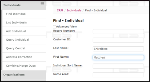 - After you click on Individual, you will do a look up in the Find -Individual screen.