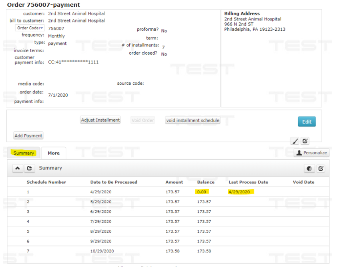 4. Back on the order profile page under the “Summary” tab and “Summary” child form you will see that a payment has been made because the “Balance” will be 0.00 and “Last Process Date” will be today for the installment payment in question.