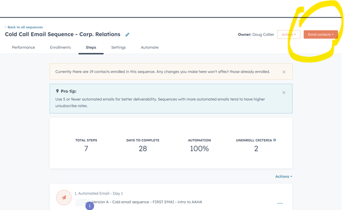 After viewing a sequence and determining it's right for you, you can enroll a single contact or multiple contacts in the sequence. You will need to connect inbox to Hubspot in order to do this.